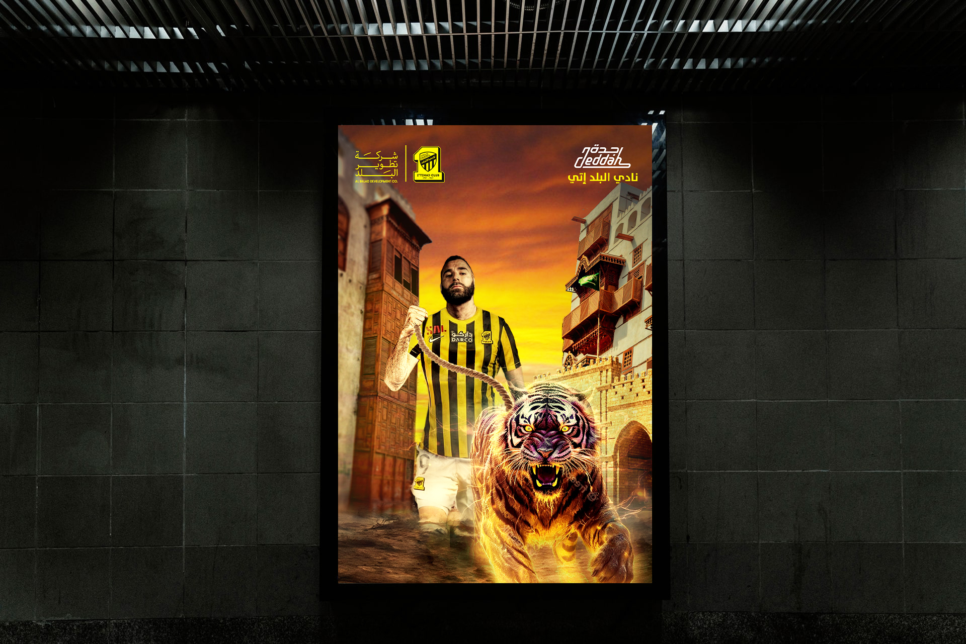 Concept: To create an artwork showing Karim Benzema in the center of the canvas, leading a tiger”Ittihad symbol” surrounded by the old architecture buildings of Al Balad. This creates a juxtaposition between the historic beauty of old Jeddah and the high energy modern world of professional football.